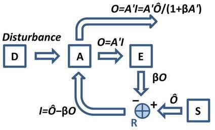 Keywords: Set-point version of negative feedback amplifier.png en Block diagram for negative feedback amplifier using the desired output signal that is provided as a set-point value Ô by block S and the feedback provided as an attenuated output O by the block E that monitors the state of the amplifier The amplifier gain A is changed by the disturbance D to a new value A ² and provided the gain is large the output is Ô/ regardless of any alteration in gain caused by D 2014-06-20 14 28 07 own Brews ohare cc-zero Uploaded with UploadWizard Negative feedback |