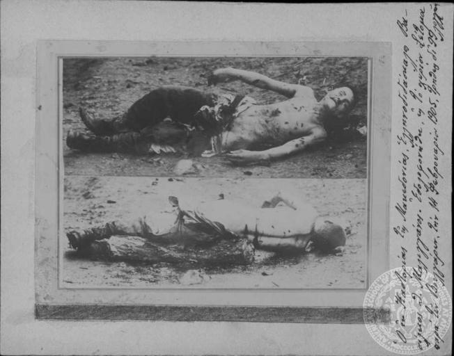 | Keywords: Setoma-teacher-dead2.jpg ъ твото тяло на косту чанина Василиос алеганос г ъцки учител в село Сетома днес Кефала и Гъ ция убит от бълга и The dead body of Vassilios Maleganos Kastoria born Greek teacher in the village of Setoma today Kefalari Greece killed by Bulgarians Λεωνίδας Πα άζογλου Φωτογραφικά ορτραίτα α ό την Καστοριά και την εριοχή της την ερίοδο του ακεδονικού Αγώνα ουσείο Φωτογραφίας Θεσσαλονίκης 2004 1905 Leonidas Papazoglou 1872 - 1918 PD-art Male corpses Greek Struggle for Macedonia Pictures by Leonidas Papazoglou 1905 in Greece Historical images of the Kastoria Prefecture |