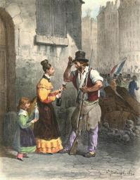 | Keywords: Seulement de l'eau rougie, la petite mère; 29 Juillet 1830.jpg Artwork Creator Hippolyte Bellangé Only red-colored water ma'am A man holding a gun tips his hat to a woman and a little girl in an alley The woman is holding a bottle and a filled glass of wine The girl is holding a carafe In the background there is a large crowd of men one of whom is holding the tricolor French flag 1831 color lithograph cm 32 23 Institution Brown University Library object history exhibition history credit line Hippolyte Bellangé Album patriotique Paris Gihaut 1831 accession number 1161806318368748 PD-old-100 Hippolyte Bellangé Images of Paris from the Brown University Library French Revolution of 1830 Lithographs of Paris Flags of France in art |
