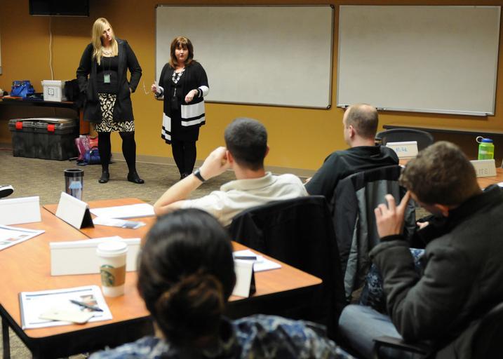 Keywords: Sexual Assault Prevention (SAPR) Victim Advocate (VA) Training 150115-N-ZY850-013.jpg en Naval Base Kitsap Bangor Sexual Assault Prevention SAPR Victim Advocates Nicki Hayford left and Candy Cardinal right explain a possible scenario during a SAPR VA training course The training will certify the attendees as SAPR Victim Advocates allowing them to help raise awareness of and eliminate sexual assault from the Navy U S Navy photo by Mass Communication Specialist 2nd Class Jamie Hawkins/Released 2015-01-15 Jamie Hawkins https //www dvidshub net/image/1729923 150115-N-ZY850-013 2015-01-21 10 17 SILVERDALE WA US PD-USGov-Military-Navy Naval Base Kitsap Images from DoD uploaded by Fæ |