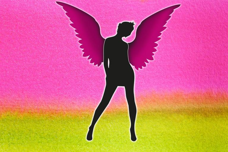 Keywords: sexy angel woman wing mini skirt pink magenta green shimmer female silhouette sensuality