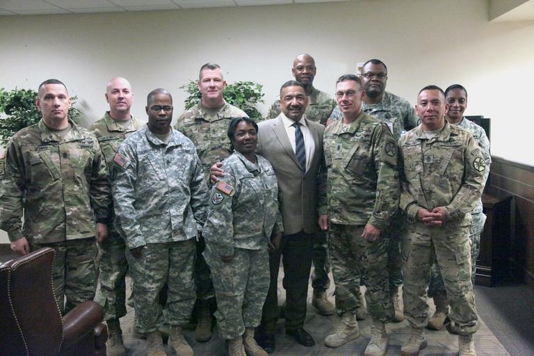Keywords: Sergeants major from around IMCOM headquarters gathered Jan. 5 to honor former Sgt. Maj. Luis Miranda-Gonzalez, who recently retired. U.S. Army IMCOM photo by Neal Snyder.