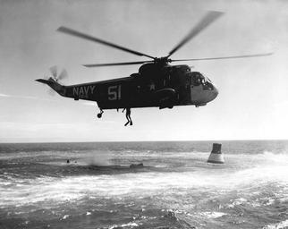 Keywords: SH-3A Sea King of HS-6 practices Mercury space capsule recovery 1963.jpg A U S Navy Sikorsky SH-3A Sea King BuNo 149726 of Helicopter Antisubmarine Squadron HS-6 Indians dropping rescue swimmers around a Mercury space capsule mock-up during recovery practice prior to the Mercury-Atlas 9 mission flown by Major Leroy Gordon Cooper USAF HS-6 was assigned to Carrier Anti-Sumbarine Air Group 53 CVSG-53 aboard the aircraft carrier USS Kearsarge CVS-33 which recovered Cooper on 16 May 1963 at 0273000N 1761500W in the Pacific Ocean 130 km south east of Midway Atoll http //collections naval aviation museum/emuwebdoncoms/pages/doncoms/AdvQuery php U S Navy National Museum of Naval Aviation photo No http //collections naval aviation museum/emuwebdoncoms/pages/doncoms/Display php irn 42723 QueryPage 2Femuwebdoncoms 2Fpages 2Fdoncoms 2FAdvQuery php 2008 103 016 ca 1963-04 U S Navy File SH-3A Sea King HS-6 practicing Mercury space capsule recovery 1963 jpg PD-USGov-Military-Navy SH-3A Sea King Helicopter Anti-Submarine Squadron 6 United States Navy Mercury-Atlas 9 |