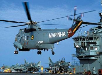 Keywords: SH-3D Sea King on Brazilian carrier Sao Paulo 2003.jpg A Brazilian Navy Sikorsky SH-3D Sea King landing aboard the aircraft carrier Saõ Paulo A12 in 2003 Note the McDonnell Douglas AF-1 Skyhawk fighters refurbished A-4KU in the background U S Navy Naval Aviation News September-October 2003 http //www history navy mil/nan/backissues/2000s/2003/so03/brazil pdf 2003 USN PD-USGov-Military-Navy H-3 Sea King in service with Brazil A-4 Skyhawk of the Navy of Brazil NAe São Paulo ship 1959 |