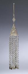 Keywords: Sh Sharayan - Triangular Pendant from a Woman?s Headpiece - Walters 572314.jpg This pendant was one of a pair and was part of a woman's headpiece The triangle is cast the loops soldered on The motif combines rosettes spirals circles and rhombic granulation clusters and is framed by a bead-molded border The top loop connects to a smaller rhombic element with circle and semicircle filigree and to an elongated hook with square and double-dot décor Ten chains hanging down from the five bottom loops and each has a stylized hand pendant at its end The back of the pendant has an Arabic stamp with the date nusfi 128x The term nusfi means half and the last number of the date is lost but it must be a number in the later 1280s AH AD late 1860s-early 1870s In addition there is the name of the silversmith engraved in Hebrew Sh lomo Sharayan mahasit The same silversmith is named on the pendants of Walters 57 2313 The term mahasit means half 1285-1289 AH/AD 1865-1875 silver Triangle H without loops 1 15/16 x W of base 1 9/16 in 5 x 4 cm accession number 57 2314 80918 Mr Benjamin Zucker Zucker Family Trust and Mr Derek Content New York and London by purchase Walters Art Museum Joint gift to the Walters Art Museum Baltimore and the Israel Museum Jerusalem by Mr Benjamin Zucker and Mr Derek Content in honor of Mrs Barbara Zucker and Mrs Amanda Content 2010 Stamp Arabic nusfi 128x Engraving Hebrew S lomo Sarayan mahasit place of origin Raydah Yemen Walters Art Museum license Jewellery in the Walters Art Museum South Arabian art in the Walters Art Museum Sh Sharayan Media contributed by the Walters Art Museum needs category review Sh Sharayan - Triangular Pendant from a Woman?s Headpiece - Walters 572314.jpg This pendant was one of a pair and was part of a woman's headpiece The triangle is cast the loops soldered on The motif combines rosettes spirals circles and rhombic granulation clusters and is framed by a bead-molded border The top loop connects to a smaller rhombic element with circle and semicircle filigree and to an elongated hook with square and double-dot décor Ten chains hanging down from the five bottom loops and each has a stylized hand pendant at its end The back of the pendant has an Arabic stamp with the date nusfi 128x The term nusfi means half and the last number of the date is lost but it must be a number in the later 1280s AH AD late 1860s-early 1870s In addition there is the name of the silversmith engraved in Hebrew Sh lomo Sharayan mahasit The same silversmith is named on the pendants of Walters 57 2313 The term mahasit means half 1285-1289 AH/AD 1865-1875 silver Triangle H without loops 1 15/16 x W of base 1 9/16 in 5 x 4 cm accession number 57 2314 80918 Mr Benjamin Zucker Zucker Family Trust and Mr Derek Content New York and London by purchase Walters Art Museum Joint gift to the Walters Art Museum Baltimore and the Israel Museum Jerusalem by Mr Benjamin Zucker and Mr Derek Content in honor of Mrs Barbara Zucker and Mrs Amanda Content 2010 Stamp Arabic nusfi 128x Engraving Hebrew S lomo Sarayan mahasit place of origin Raydah Yemen Walters Art Museum license Jewellery in the Walters Art Museum South Arabian art in the Walters Art Museum Sh Sharayan Media contributed by the Walters Art Museum needs category review |