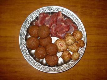 Keywords: Shabdeg Main Ingredients.JPG en Shabdeg/Shab daig main ingredients are golden fried and pricked turnips Gongloo/Shaljam mutton koftas and boneless mutton/lamb own Miansari66 Cuisine of Pakistan Cuisine of Karachi Cuisine of Kashmir Cc-zero