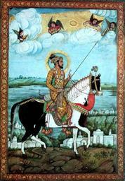 | Keywords: Shah Jehan with Angel musicians.jpg cm 53 4 36 9 Joseph J Palackal private collection en Shah Jahan 1592-1666 the fifth ruler of the Mughal Empire and the creator of the Taj Mahal is riding upon his royal horse on the rugged banks of the river Jamuna Taj Mahal is not built yet Following the Christian tradition introduced to the Mughal court by the Jesuit missionaries at the time of Akhbar the Emperor appears like a saint with a halo around his head Four angels two on each side of the divine effulgence descend from the heavenly clouds The angel on the right counteracts the sharpness of the Emperor's spear with the sweetness of music flowing from the trumpet The second angel on the right is putting the third necklace on the shoulder of the Emperor The second angel on the left is offering a crown and the angel at the extreme left is holding http //www thecmsindia org/art html PD-old Other versions Paintings of Shah Jahan Paintings of angels 17th-century Mughal miniatures Watercolor paintings of men of India Horse riders in art of India |