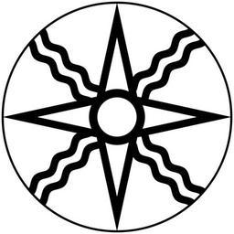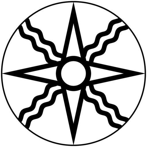 Keywords: Shamash-sun-symbol.svg A slightly schematized/simplified version of one form of the ancient symbol of the Mesopotamian sun-god Shamash with alternate pointy and wavy rays According to Gods Demons and Symbols of Ancient Mesopotamia An Illustrated Dictionary by Jeremy Black and Anthony Green 1992 ISBN 0-292-70794-0 p 168 it occurs from the Akkadian down to the Neo-Babylonian period and The Akkadian names of the symbol were šamšatu and niphu It was often represented on a pole as a standard For modern symbols which incorporate a version of the Shamash sun-symbol see File Flag of the Assyrian people svg File Iraq state emblem CoA 1959-1965 Qassem svg etc This is an SVG version of File Star of Shamash png attempting to duplicate the appearance of the PNG file but generated from abstract geometry and symmetrical converted from the following vector PostScript source code <pre> /A 0 1 2 pop 18 5 0 35 9 45 13 5 rcurveto 10 4 5 26 5 13 5 45 13 5 rcurveto 18 5 0 35 -9 45 -13 5 rcurveto 10 -4 5 26 5 -13 5 45 -13 5 rcurveto for stroke def 287 287 translate 1 -1 scale 5 2 setlinewidth 0 0 280 5 0 360 arc closepath stroke 20 5 setlinewidth 0 0 58 5 0 360 arc closepath stroke gsave 45 rotate 38 setlinewidth 0 1 3 gsave 39 5 scale dup 2 eq 1 -1 scale if 3 eq 1 -1 scale if 178 -13 5 25 sub moveto A 178 -13 5 52 add moveto A grestore 90 rotate for grestore 18 setlinewidth 4 42 426 42 426 moveto 238 0 lineto 42 426 -42 426 lineto stroke 90 rotate repeat showpage EOF</pre> Archaeological star glyphs Star of Shamash Images with PostScript source code |