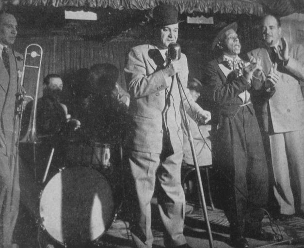 Keywords: SharkeyBandstand1950Kubrick.JPG Sharkey Bonano band on stage in New Orleans 1950 Published caption SHARKEY BONANO The man at the mike plays the cleanest Dixieland trumpet style in New Orleans Others pictured Santo Pecora trombone; Monk Hazel drums; dancer Isaac Pork Chops Mason; clarinetist Lester Bouchon Notes Probably photographed on Bourbon Street French Quarter Dancer Pork Chop was part of dance duo Pork Chop Kidney Stew who danced in the streets busking for tips; Sharkey regularly invited them into the club and up on stage with him during the evening show and the the three would perform a comic dance together Lester Bouchon also played saxophone Photograph by Stanley Kubrick published in Look Magazine 6 June 1950 Photographed from original magazine by Infrogmation <span class signature-talk >talk</span> Note Higher quality scan would be welcome 1950 Stanley Kurbrick PD-Look http //www loc gov/rr/print/res/378_kubr html Sharkey Bonano Jazz ensembles Stanley Kubrick Music in 1950 Men with microphones 1950 in New Orleans Men at work in New Orleans |