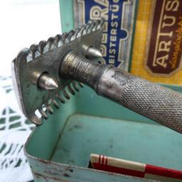 Keywords: shaver body care man shaving razor blade antique old wet shaving cosmetics men bathroom bart hair male sheet box tin can brand name