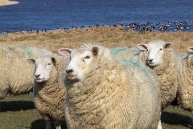Keywords: sheep close portrait face meadow pasture water sea dike coast northern germany animal nature graze wool flock north sea north sea coast grass green landscape stand spring waters blue