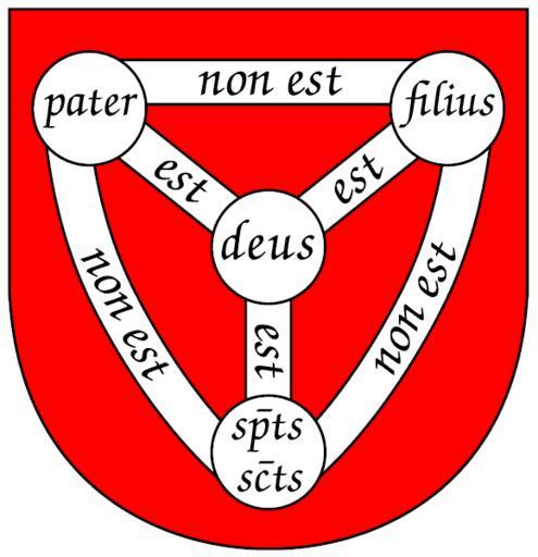 Keywords: Shield-Trinity-medievalesque.png Medieval-style version of the Shield of the Trinity diagram of traditional western Christian symbolism shown on a red shield The three nodes at the edge of the diagram are labelled with the Latin-language names of the three persons of the Trinity The Father PATER The Son FILIUS and The Holy Spirit scribal abbreviation of SPIRITUS SANCTUS The node in the center of the diagram within the triangle formed by the other three nodes is labelled God Latin DEUS while the three links connecting the center node with the outer nodes are labelled is Latin EST and the three links connecting the outer nodes to each other are labelled is not Latin NON EST -- showing that the three persons of the Trinity are all God but are not the same as each other All connecting links between nodes are non-directional two-way This was considered to be the heraldic coat of arms of God or of the Trinity in 15th-century England and France The banner of the Trinity which Jean Le Fevre Seigneur of St Remy and Jehan de Wavrin attest that Henry V of England displayed at Agincourt would have been the same but with the emblem on a red flag instead of a red shield See File Scutum Fidei on Holy Trinity pulpit - geograph org uk - 1061634 jpg for a photograph of a church decoration A Victorian medievalesque version of this can be seen at http //www heraldsnet org/saitou/parker/Jpglosst htm Trinity as part of the on-line version of the 1894 book A Glossary of Terms Used in Heraldry by James Parker For one medieval version of this coat of arms of God though with a blue background instead of the red used in England see File Wernigeroder Wappenbuch 010 jpg For further explanation a heraldic blazon and links to other medieval versions of this diagram see the main Shield of the Trinity article For alternative versions of this diagram on Wikimedia Commons see Image 3enighed png Image Shield-Trinity-Scutum-Fidei-basic png Image Trinidad-Anglican-Episcopal-Coat-of-Arms-large png and Image Trinity knight shield jpg medieval This graphic was generated by means of the following PostScript code note that this program references the Zapf Chancery Medium Italic font which is part of the Basic 35 Postscript fonts but not the Basic 14 <pre> /L rlineto def/m moveto def/x 0 0 def/c newpath 60 0 360 arc gsave 1 1 1 setrgbcolor fill grestore stroke def/v rmoveto def/M xmakefont setfont def/r rotate def 2 75 setlinewidth/t /ZapfChancery-MediumItalic findfont def gsave 1 035 dup scale 563 2318840 413 309179 m 0 285 724637 L -529 0 L 0 -285 724637 L 0 -5 0 -5 1 -17 rcurveto 16 -192 162 -248 262 -248 rcurveto 4 0 L 100 0 245 56 261 248 rcurveto 1 12 1 12 1 17 rcurveto gsave 1 x setrgbcolor fill grestore stroke grestore 9 1875 28 translate/X t60 0 -6 60 M def/Z X 49 5 0 v non e show 7 0 v st show def/W X 14 -1 75 v e show 7 0 v st show def 95 587 575 075 m 180 598 -144 434 L 0 -228 241 L 47 63 0 L 0 228 241 L 180 587 144 434 L -23 815 41 25 L -180 587 -144 434 L -181 137 144 434 L gsave 1 1 1 setrgbcolor fill grestore stroke gsave 0 1 translate 514 641 m -429 0 L -25 -18 L 2 -77 15 -165 55 -244 rcurveto 39 -77 98 -159 160 -202 rcurveto 49 0 L 62 42 121 125 160 202 rcurveto 40 79 54 166 56 243 rcurveto 491 594 m -3 -53 -15 -125 -49 -194 rcurveto -37 -74 -92 -153 -142 -185 rcurveto -50 32 -106 111 -143 185 rcurveto -34 69 -45 141 -48 194 rcurveto closepath gsave 1 1 1 setrgbcolor fill grestore stroke 1 x setrgbcolor 57 628 m 0 -8 L 8 0 L 0 8 L fill x 0 setrgbcolor 174 603 75 m Z gsave 62 r 420 -237 m Z grestore gsave -62 r -387 292 m Z grestore grestore 300 444 391 c 110 85 590 7 c 489 15 590 7 c 300 227 4 c gsave 38 64 r 583 145 5 m W grestore gsave -38 64 r -206 520 3 m W grestore gsave -90 r -381 288 m W grestore t 54 0 -5 4 54 M 60 584 m p show - 5 0 v ater show 442 584 m \256lius show 259 241 5 m spt show 6 0 v s show 280 5 242 m \305 show 265 187 m sct show 6 0 v s show 282 187 5 m \305 show 246 431 75 m t61 5 0 -6 15 61 5 M 1 5 0 deu ashow 1 5 0 v s show showpage EOF</pre> 2006 AnonMoos <gallery>File Scutum Fidei on Holy Trinity pulpit - geograph org uk - 1061634 jpg</gallery> Shield-Trinity-medievalesque svg Trinity in heraldry Images with PostScript source code |