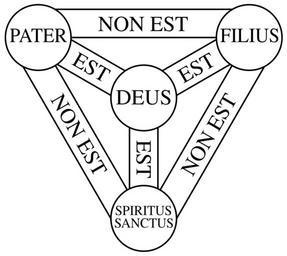 Keywords: Shield-Trinity-Scutum-Fidei-compact.svg Compact version of a basic minimal equilateral triangular version of the Shield of the Trinity or Scutum Fidei diagram of traditional Christian symbolism with original Latin captions Le « bouclier » ou l' « écusson » de la Trinité un symbole traditionnel dans le christianisme occidental Own -- Converted from the following PostScript vector source code <pre> / def def/N counttomark /Q grestore /r rotate /s setrgbcolor /p N 2 idiv N -2 roll rlineto repeat /q gsave /m moveto /M x o /x 0 0 /O show /t /Times-Roman /c newpath 55 0 360 arc q 1 setgray fill Q l /l stroke /v rmoveto /o selectfont mark 2 5 setlinewidth/X t 36 o /Z X 49 5 0 v NON EST O /W X 14 0 v EST O 2 120 translate 95 587 575 075 m 180 598 -104 434 0 -208 241 47 63 x 208 241 180 587 104 434 -23 815 41 25 -180 587 -104 434 -181 137 104 434 p l 124 821 585 7 m 175 179 -303 3 175 179 303 3 -350 359 0 p l 72 321 581 04 m 197 679 -342 39 60 0 197 679 342 39 -30 51 96 -395 359 0 p l 174 596 5 m Z q 60 r 446 -155 m Z Q q -60 r -395 365 m Z Q 300 484 391 c 123 171 585 7 c 476 829 585 7 c 300 282 4 c q 30 r 558 257 m W Q q -30 r -130 558 m W Q q -90 r -427 5 288 m W Q t32 x 34 M 75 32 578 m P O -2 5 0 v A O -2 5 0 v TER O 428 18 578 m FILIUS O 253 25 473 5 m X DEUS O t22 x 23 M 252 288 m SPIRITUS O 250 75 267 m S O - 75 0 v ANCTUS O pop showpage EOF</pre> 2009-11-18 AnonMoos For a less compact version of this see Image Scutum fidei LAT svg In other languages <gallery> File Shield-Trinity-Scutum-Fidei-English svg English File Escudo-de-la-Fe_Simbolo-Atanasiano svg Spanish File Schild-Dreieinheit-Scutum-Fidei-Deutsch svg German File Turs-ul-Iman_Shi 27ar-uth-Thaluth svg Arabic File Shield-Trinity-Separ-Iman-Farsi svg Persian File Sxildo-de-fido_de-la-Triunuo svg Esperanto File Shield_Trinity_ zh-cn svg Cantonese File 3enighed-heb svg Hebrew File Shield of the Trinity diagram - language-neutral concept svg Quasi-language-neutral </gallery> For other versions of this emblem see Image 3enighed png Image Shield-Trinity-medievalesque png Image Trinidad-Anglican-Episcopal-Coat-of-Arms-large png and Image Trinity knight shield jpg For discussion and explanation see the main article en Shield of the Trinity derivative works Shield Trinity zh-cn svg Shield of the Trinity Images with PostScript source code SVG in Latin |