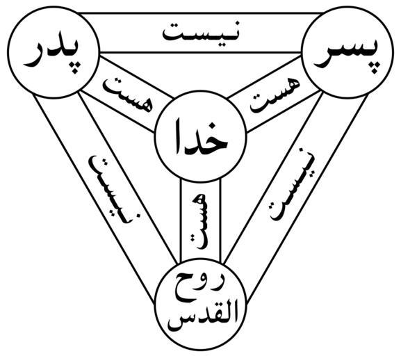 Keywords: Shield-Trinity-Separ-Iman-Farsi.svg Basic minimal equilateral triangular version of the Shield of the Trinity or Scutum Fidei diagram of traditional Christian symbolism with translated Farsi Persian-language captions in place of original Latin For discussion and explanation see the main article Shield of the Trinity The Farsi for Scutum Fidei Ephesians 6 16 is سپر ايمان Self-made graphic using the Farsi captions from PD image fa File Trinity-persian copy jpg Text was converted to paths for improved display See File Turs-ul-Iman_Shi 27ar-uth-Thaluth svg for PostScript vector source code for Arabic-language version 2009 AnonMooos For other versions of this emblem on Wikimedia Commons see Image 3enighed svg Image Shield-Trinity-medievalesque svg Image Trinidad-Anglican-Episcopal-Coat-of-Arms svg Image Trinity knight shield jpg etc Versions in other languages <gallery> File Shield-Trinity-Scutum-Fidei-compact svg Latin File Shield-Trinity-Scutum-Fidei-English svg English File Schild-Dreieinheit-Scutum-Fidei-Deutsch svg German File Escudo-de-la-Fe Simbolo-Atanasiano svg Spanish File Turs-ul-Iman_Shi 27ar-uth-Thaluth svg Arabic File Sxildo-de-fido_de-la-Triunuo svg Esperanto File Shield_Trinity_ zh-cn svg Cantonese File 3enighed-heb svg Hebrew File Shield of the Trinity diagram - language-neutral concept svg Quasi-language-neutral </gallery> Shield of the Trinity Diagrams in Persian Texts in Arabic script rendered to SVG Generated by PostScript |