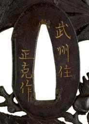 Keywords: Shôami Masakatsu - Tsuba with Autumn Leaves - Walters 51342 - Mark A.jpg Surrounding the central opening of this tsuba is an openwork design of autumn leaves At the upper right is a maple leaf Two chestnuts leaves fill the lower right and the bottom edge of the tsuba A pine cone and a gingko leaf complete the motif ca 1780 1800 Edo iron gold cm 7 0 5 diam x d accession number 51 342 16289 Henry Walters Baltimore date and mode of acquisition unknown Walters Art Museum Henry Walters Acquired by Henry Walters Transliteration bushû jû/masakatsu saku; Translation Made by Maskatsu residing in Bushû place of origin Edo present-day Tokyo Japan Walters Art Museum license Tsuba in the Walters Art Museum Media contributed by the Walters Art Museum needs category review Tsuba by Shôami Masakatsu |
