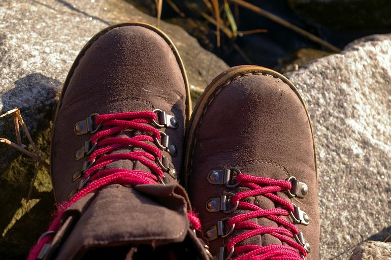 Keywords: shoe trekking eyelets sole shoelace hiking shoes shoe lace shoelaces bind tie shoes bicycle tour pink knot hiking rest break wanderer hike sit rest pause resting place trail relax click