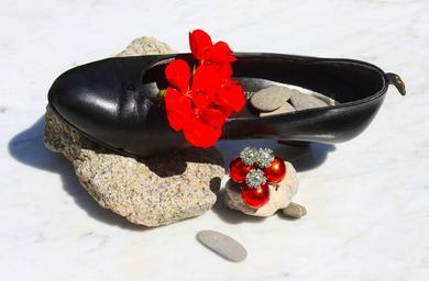 Keywords: shoes pumps evening going out leather marble stone cloth gala make up love romance lipstick red flower geranium cherry