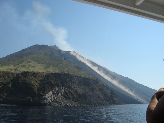 Keywords: sicily stromboli volcano erupts sea island sky smoke boat