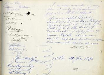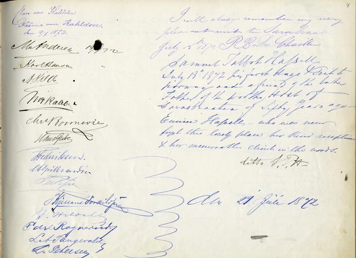Keywords: sarabråten østmarka gjestebok hyttebok gjester signatur signaturer navnetrekk signature thomas joh. heftye thomasjohheftye thomas johannessen heftye thomasjohannessenheftye thomas j. heftye thomasjheftye thomas heftye thomasheftye heftye document text writing drawing sketch whiteboard texture Hilsner fra bl a Du Chaillu, Paul Belloni (1835 – 1903). Amerikansk oppdagelsesreisende. Skrev bl.a. reiseskildringer fra Norge og Sarabråten. Og Samuel Talbot Hassell (1797 - 1882) Britisk adelsmann fra Yorkshir. Med kone. Hilsner fra bl a Du Chaillu, Paul Belloni (1835 – 1903). Amerikansk oppdagelsesreisende. Skrev bl.a. reiseskildringer fra Norge og Sarabråten. Og Samuel Talbot Hassell (1797 - 1882) Britisk adelsmann fra Yorkshir. Med kone. |