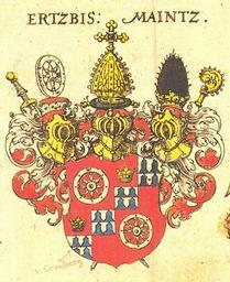 Keywords: Siebmacher003-Erzbistum-Mainz.jpg Kurmainz 1605 Johann Schweikhard von Kronberg 15 Juli 1553; 17 September 1626 in Aschaffenburg war von 1604 bis 1626 Erzbischof und KurfĂĽrst von Mainz Siebmachers Wappenbuch thumb left 1605 creator Johann Siebmacher Reproduction of a painting that is in the public domain because of its age PD-old-100 Siebmacher - Kurfuersten Mainz Johann Schweikhard von Kronberg Coats of arms of archbishops of the Roman Catholic Diocese of Mainz Wheel of Mainz in heraldry Derivatives of the Coat of arms of Kronberg family Derivatives of the Coat of arms of Mainz diocese |
