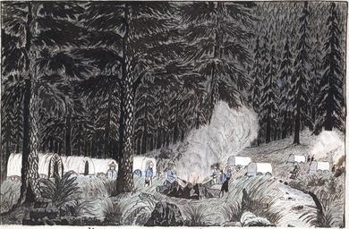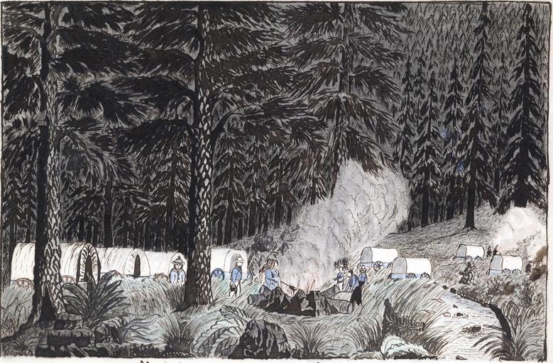 Keywords: Sierra-Nevada-Mountain-Camp-Jenks.jpeg Mountain camp Siera sic Nevada Drawing shows a camp in the heart of a forest of tall pines Covered wagons rest their wheels nearly hidden by tall grass in the clearing Men and women cook over a large open fire near a stream in the Sierra Nevada Mountains having left Susanville California that morning on Saturday August 13 1859 and made camp here MEDIUM 1 drawing on paper graphite ink and crayon ; 17 7 × 25 3 cm sheet Library of Congress Prints Photographs Division LC-DIG-ppmsc-04820 digital image from original http //memory loc gov/master/pnp/ppmsc/04800/04820u tif archival TIFF version 15 MiB color level pick white and black point cropped and converted to JPEG with the GIMP 2 6 6 image quality 88 1859-08-13 Daniel A Jenks 1827 “1869 No known restrictions on publication LOC-image ppmsc 04820 PD-old American drawing Campsites in art Covered wagons in art Sierra Nevada of North America in art Daniel A Jenks Wagon trains 1859 in California