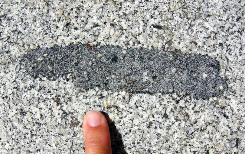 | Keywords: SierraXenolith.JPG en Gabbro as a xenolith in a granite eastern Sierra Nevada Rock Creek Canyon California Own Wilson44691 2008-08 Photograph taken by Mark A Wilson Department of Geology The College of Wooster http //markwilson voices wooster edu/ Xenoliths |