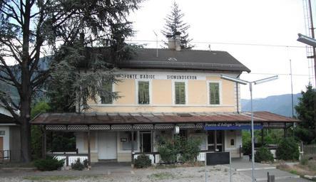 Keywords: Sigmundskron Ponte d'Adige Railway Station.jpg 46 485623 11 297513 it Stazione ferroviaria di Ponte d'Adige BZ Alto Adige Italia Ferrovia Bolzano-Merano de Bahnhof Sigmundskron Südtirol Italien Bahnstrecke Bozen “Meran en Railway station Ponte d'Adige-Sigmundskron South Tyrol Italy Railway Bolzano-Merano Denkmalgeschütztes Objekt Südtirol 50397 2011-04-30 own Emilio2005 cc-zero Uploaded with UploadWizard Sigmundskron train station |