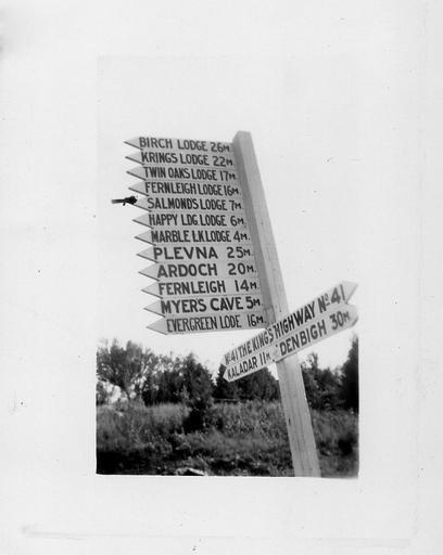 | Keywords: sign signpost cloyne highway 41 highway41 highway 506 highway506 land o lakes landolakes lodges fishing resorts fishingresorts lodge myer's cave myerscave birch lodge birchlodge happy landing lodge happylandinglodge marble lake lodge marblelakelodge plevna ardoch fernleigh evergreen lodge evergreenlodge kaladar denbigh krings lodge kringslodge twin oaks lodge twinoakslodge fernleigh lodge fernleighlodge blackandwhite monochrome text black and white Unknown date of photograph c1945. It is a concrete testament to the great attraction for tourists that the greater Mazinaw area had. The sign depicts 9 lodges on the shores of only three lakes east of Highway 41. Similar groups of lodges could be found on many of the lakes in the area in the years before and immediately after WW Ii. Part of the Eileen Flieler Collection, Unknown date of photograph c1945. It is a concrete testament to the great attraction for tourists that the greater Mazinaw area had. The sign depicts 9 lodges on the shores of only three lakes east of Highway 41. Similar groups of lodges could be found on many of the lakes in the area in the years before and immediately after WW Ii. Part of the Eileen Flieler Collection, |