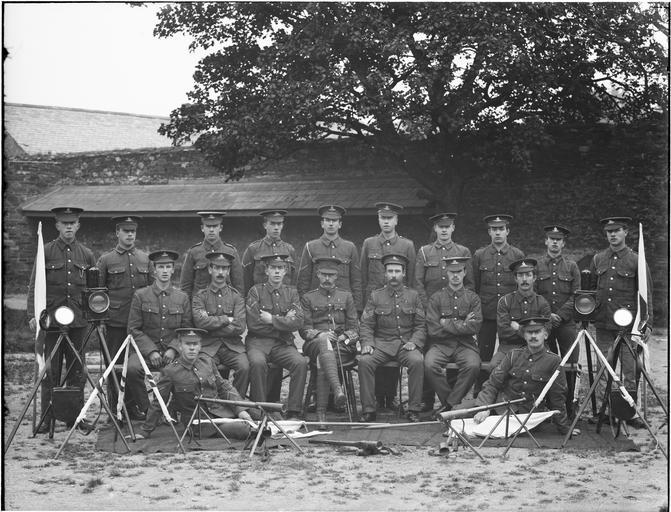 Keywords: major heath majorheath royal irish artillery royalirishartillery artillery soldiers uniforms waterford ireland munster barracks a.h. poole ahpoole arthur henri poole arthurhenripoole poole collection poolecollection glass negative glassnegative wednesday 19th september 1906 20th century 20thcentury national library of ireland nationallibraryofireland artillery barracks artillerybarracks cannon street cannonstreet blakes lane blakeslane gunner lance bombardier lancebombardier captain sergeant begbie lamp begbielamp paraffin lamp paraffinlamp signals detail signalsdetail lanyards semaphore flags heliographs blackandwhite monochrome outdoor black and white ... and their equipment. These are signal men of the Royal Irish Artillery under Major Heath in Waterford. The major may be in the photo. Photographer: Poole Photographic Studios, Waterford Date: Wednesday, 19 September 1906 NLI Ref: POOLEWP 1614a You can also view this image, and many thousands of others, on the NLI’s catalogue at catalogue.nli.ie ... and their equipment. These are signal men of the Royal Irish Artillery under Major Heath in Waterford. The major may be in the photo. Photographer: Poole Photographic Studios, Waterford Date: Wednesday, 19 September 1906 NLI Ref: POOLEWP 1614a You can also view this image, and many thousands of others, on the NLI’s catalogue at catalogue.nli.ie ... and their equipment. These are signal men of the Royal Irish Artillery under Major Heath in Waterford. The major may be in the photo.