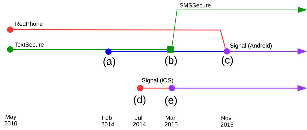 | Keywords: Signal timeline.svg Signal Sources TextSecure and Signal Android apps are above and iOS app is below Events <br/> a Open Whisper Systems updated their protocol to version 2 adding group chat and instant messaging capabilities <br/> b Open Whisper Systems ended support for encrypted SMS/MMS messaging on Android This prompted some users to create a fork which is named SMSSecure and is meant solely for encrypted SMS/MMS messaging <br/> c Open Whisper Systems merged RedPhone into TextSecure and renamed it as Signal <br/> d Open Whisper Systems launched Signal as a RedPhone counterpart for iOS <br/> e Open Whisper Systems added support for encrypted group chat and instant messaging Colours legend FF0000 Red Encrypted voice calling capabilities 00DA34 Green Encrypted SMS/MMS messaging capabilities in TextSecure and subsequently in SMSSecure a third-party fork of TextSecure 4200FF Blue Encrypted group chat and instant messaging capabilities B000FF Purple Signal for Android and iOS after both had encrypted group chat instant messaging and voice calling capabilities 2016-03-30 own Dodi 8238 other versions cc-zero Open Whisper Systems |