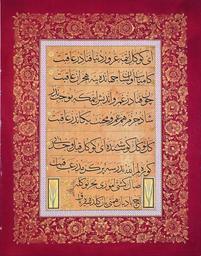 | Keywords: Signed Mahmud Celaleddin - Levha (calligraphic inscription) - Google Art Project.jpg 1750 Signed 591902 Mahmud Celaleddin 1750 /collection/sakp-sabanc-museum/artwork/levha-calligraphic-inscription-signed-mahmud-celaleddin/574848/ Signed Mahmud Celaleddin /artist/mahmud-celaleddin/4126481/ 4126481 /collection/sakp-sabanc-museum/ Sakıp Sabancı Museum 479109 http //muze sabanciuniv edu/ 12/28/2011 6 21 37 PM /collection/sakp-sabanc-museum/artwork/levha-calligraphic-inscription-signed-mahmud-celaleddin/574848/ 1750 1700s 535 574848 False 1750 3/24/2012 5 16 43 AM 130-0074-MC Sakıp Sabancı Museum Ink colours and gold on paper 1750 1760 w415 x h535 mm 1700s False 0 78515625 Sakıp Sabancı Museum Object levha-calligraphic-inscription-signed-mahmud-celaleddin Levha calligraphic inscription l 415 special url_id RgE7GfBwuDc83w PD-old-100 Google Art Project works by Mahmud Celaleddin Google Art Project Uncategorized 2015 March 25 |
