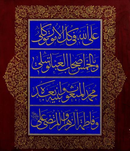 | Keywords: Signed Mahmud Celaleddin - Levha (calligraphic inscription) - Google Art Project (591903).jpg Arabic text reads على الله في كل الأمور توكلى وبالخمس أصحاب العباء توسلى محمد المبعوث وابنيه بعده وفاطمة الزهراء والمرتضى على 1750 Signed 591902 Mahmud Celaleddin 1750 /collection/sakp-sabanc-museum/artwork/levha-calligraphic-inscription-signed-mahmud-celaleddin/591903/ Signed Mahmud Celaleddin /artist/mahmud-celaleddin/4126481/ 4126481 /collection/sakp-sabanc-museum/ Sakıp Sabancı Museum 479109 http //muze sabanciuniv edu/ 12/28/2011 6 21 37 PM /collection/sakp-sabanc-museum/artwork/levha-calligraphic-inscription-signed-mahmud-celaleddin/591903/ 1800 1800 635 591903 False 1800 3/24/2012 6 39 50 AM 130-0100-MC Sakıp Sabancı Museum Gold on paper 1800 1810 w550 x h635 mm 1800 False 0 861328125 Sakıp Sabancı Museum Object levha-calligraphic-inscription-signed-mahmud-celaleddin Levha calligraphic inscription l 550 special url_id dgGsk_3htnjtEw PD-old-100 Google Art Project works by Mahmud Celaleddin Calligraphy in Turkey |