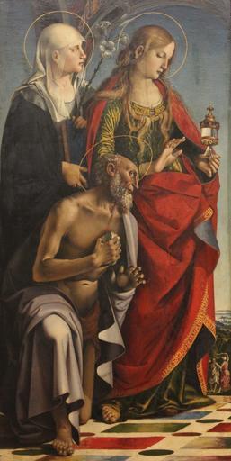 Keywords: Signorelli, St Augustine Altarpiece left.jpg Artwork Creator Luca Signorelli de Im Gegensatz zum linken Flügel sind die Heiligen hier parallel angeordnet der hl Hieronymus ist im Vordergrund links 1491 oil poplar size cm 146 5 75 5 Gemäldegalerie Berlin XVIII http //www bpk-images de/shop bpkgate picturemaxx com search 00022962<br>http //www spk-digital de/showDetail html id 22/bam/museum/smb/gg/00022962 22 Stiftung Preußischer Kulturbesitz<br> 02552278 Teil 001 http //www wga hu/html/s/signorel/various/61bichi html Web Gallery of Art<br>Laurence B Kanter Tom Henry Luca Signorelli; Hirmer München 2002 p 21 168 169 object history from Cappella Bichi Sant'Agostino Siena <br>-1821 private Collection Berlin London<br> ProvenanceEvent 1821 acquisition credit line Christophorus geweihten Bichi-Kapelle in Sant'Agostino Siena wurde 1487 von Antonio di Giovanni Bichi stellvertretend für seine Tochter Eustachia für deren 1482 verstorbenen Gatten Cristoforo di Pietro Bellanti gestiftet Vermutlich wurde der Altar im 18 Jahrhundert zerteilt The altarpiece from the Bichi chapel in Sant'Agostino Siena was consecrated to Saint Christopher and donated 1487 by Antonio di Giovanni Bichi as representative for his daughter Eustachia for her husband Cristoforo di Pietro Bellanti who had died in 1482 Presumably the altar was divided in the 18th-century accession number 79 own <gallery> Signorelli sacra famiglia di parte guelfa uffizi diam 124 cm jpg Luca signorelli Madonna and Child Saints John the Baptist and Jerome jpg </gallery> PD-old-100 painting religious Italian 1451-1500 DEFAULTSORT Signorelli St Augustine Altarpiece - left wing Pala Bichi by Luca Signorelli 010 Paintings by Luca Signorelli Paintings in the Gemäldegalerie Berlin - Room XVIII Reredos in Germany Paintings of Mary Magdalene as Myrrhbearer Renaissance paintings of Saint Jerome Sacra Conversazione with Saint Jerome 1491 paintings 1490s paintings from Italy 1490s paintings in Germany 15th-century paintings of Mary Magdalene 15th-century paintings of Saint Jerome 15th-century religious paintings in Germany |