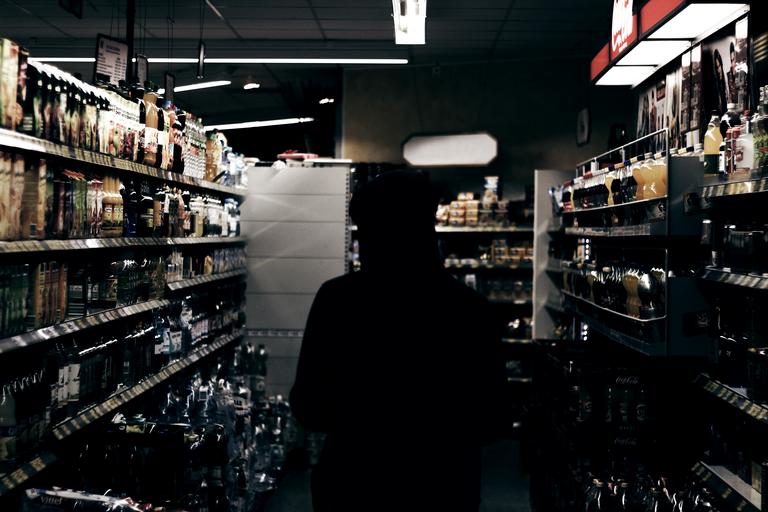 Keywords: sillhouette person alcohol liquor store store shelves shadow