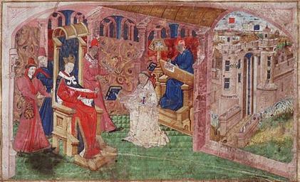 | Keywords: Simon de Hesdin presents his translation of Valerius Maximus' 'Facta et dicta memorabilia' to Charles V, king of France.jpg en Simon de Hesdin presents his translation of Valerius Maximus' 'Facta et dicta memorabilia' to Charles V king of France Contents Valerius Maximus Des faits et dits mémorables Books I-VII Translation from the Latin by Simon de Hesdin Place of origin date France; 1462 Material Vellum ff 314 368x274 287x205 mm 41 lines littera cursiva Binding 18th-century brown leather; gilt on spine Decoration 8 two-column miniatures 105x139 mm ; 1 column miniature 126x85 mm ; decorated initials with border decoration ff 1r 77r 154r 188v 197v etc Provenance Philippe de Rubempr d c 1710 Georges Joseph G rard 1734-1814 of Brussels; purchased in 1818 by the Dutch Government with the Gérard collection and placed in the Algemeen Rijksarchief now Nationaal Archief at The Hague; transferred to the KB in 1832 G rardno A 21 http //manuscripts kb nl/show/manuscript/71+D+42 Valerius Maximus Des faits et dits mémorables Books I-VII Translation from the Latin by Simon de Hesdin Author 1462 Charles V of France Simon de Hesdin Valerius Maximus Ermine clothing in art Manuscripts from Koninklijke Bibliotheek PD-old-100 |