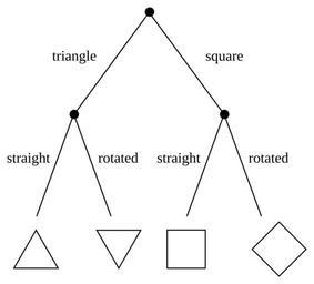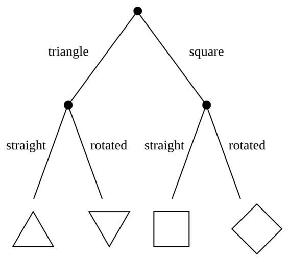 Keywords: Simple decision tree.svg Inkscape en A decision tree for four shapes Based on a figure from cite journal The physics of forgetting Landauer ™s erasure principle and information theory M B Plenio V Vitelli Contemporary Physics 2001 42 1 26 the caption of which says An example of a decision tree Two binary choices have to be made to identify the shape triangle or square and the orientation horizontal or rotated In sending with equal probability one of the four objects one therefore transmits 2 bits of information 2013-04-02 own Eviatar Bach cc-zero Uploaded with UploadWizard Binary decision diagrams Files by User InverseHypercube Information theory |