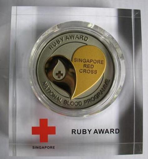 Keywords: Singapore Red Cross National Blood Programme Ruby Award.jpg This Ruby Award token is awarded by the w Singapore Red Cross to volunteer blood donors to the Singapore Blood Bank who have made 75 donations men or 50 donations women 2011-09-12 12 23 Own ProjectManhattan cc-zero Singapore Red Cross Society Blood donation awards Medals of Singapore Uploaded with UploadWizard |