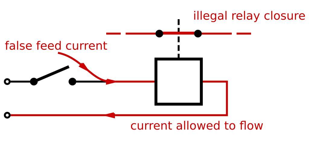 Keywords: Single switching.svg en A diagram showing a single switched relay allowing current to flow and the relay to close when a false feed current is somehow introduced Own Inductiveload 2009-01-25 Relay circuits Rail transport safety