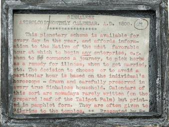 Keywords: Sinhalese astrologic monthly calendar, A.D. 1800..JPG en Image of small box which contains a Sinhalese palm-leaf manuscript calendar ca 1800 from NLM ™s MS S1 section Pasted inside the box is a typewritten note describing its contents and identifying the donor Dr Casey Wood 1856-1942 of Chicago a prominent Canadian ophthalmologist and collector Dr Wood ™s introductory text gives a snapshot of activities and remedies best applied under a favorable horoscope 2013-08-21 12 42 01 Courtesy of the National Library of Medicine Images from the History of Medicine IHM http //ihm nlm nih gov/images/A109330 Also showcased in the book Hidden Treasure New York NY Blast Books 2012 p 63 Bethesda MD U S National Library of Medicine National Institutes of Health Health Human Services 2010 Custom license marker 2013 08 21 PD-USGov Uploaded with UploadWizard Medicine Traditional medicine Astrology Manuscripts Manuscripts medical Sinhala astrology |