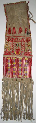 | Keywords: Sioux Quilled Tobacco Bag.JPG en wikipedia 2010 March 21 Photographed by Pierre Fabre<br/>Tobacco Bag Pierre L Fabre collection 2006 <br/>John Painter collection 2001 <br/>Photographed and described in John W Painter's<br/>Window on the Past - Volume II<br/>Sioux Quilled Tobacco Bag sinew-sewn on hide with red green yellow and purple quillwork forming flora and fauna buffalo and caterpillar images on recto Verso decorated with horizontal red quilled lines Lower panel composed of a wide span of quilled rawhide slats finishing with hide fringe and brass bells quilled hide thong terminating with tin cones hang from opening length excluding fringe 24 As discussed by Colin Taylor in his paper Wakanyan Symbols of Power and Ritual of the Teton Sioux 1987 237-257 the cocoon is a symbol that evokes powerful imagery As an emblem suggestive of several connotations the most easily understood being spiritual and physical transformation the cocoon also evokes recognition of the Sioux spirit Yumni the whirlwind responsible for the four directions of the world Walker 1917 85 Both the moth which breaks free of its confining cocoon and the untamable wind are viewed as spirits impossible to contain Clark Wissler described in his 1907 field notes the whirlwind bug a creature with spiral grooves that creates small dust clouds along the ground By this action the cloud was thought to confuse the enemy and make him loose his senses Wissler 1907 119 Similar iconography can be suggested in this tobacco bag The striped S-shaped devices could suggest the whirlwind bug with alternating purple and yellow quillwork depicting the spiral grooves The enclosed diamond above the buffalo's head may represent a cocoon leading to the idea of the Whirlwind Buffalo As noted by Taylor such a representation is shown taken from Gerrick Mallery 1893 604 Here a cocoon is clearly shown above the head of the bear and represents the whirlwind phenomena The symbolism of the cocoon on the Crazy Horse shirt can thus be interpreted with some confidence Taylor 1987 252 The combination of bear and cocoon or buffalo and cocoon implicates the harnessing these animals' powers Photographed and described in A Window of the Past Painter 2003 38 and Moths and the Plains Indian Their Fascinating Connection Painter in Taylor and Dempsey 2005 185-192 Mallery Garrick1893 Picture Writing of the American Indians Tenth Annual Report of the Bureau of American Ethnology Washington D C Taylor Colin 1987 Wakanyan Symbols of Power and Ritual of the Teton Sioux The Canadian Journal of Native Studies VII 2 237-257 Walker James R 1917 The Sun Dance and Other Ceremonies of the Oglala Division of the Teton Dakota Anthopological Paper Vol 16 2 American Museum of Natural History Wissler Clark1902 Field Notes on the Dakota Indians Collected on Museum Expedition Ms 1911 of the American Museum of Natural History New York original upload log page en wikipedia Sioux+Quilled+Tobacco+Bag JPG '1' Upload date User Bytes Dimensions Comment - nowrap 2006-10-09 04 40 18 nowrap Frogiac nowrap 1325364 nowrap 662×2229 <small><nowiki>Photographed by Pierre Fabre Tobacco Bag Pierre L Fabre collection 2006 John Painter collection 2001 Photographed and described in John W Painter's Window on the Past - Volume II Sioux Quilled Tobacco Bag sinew-sewn on hide with red green yellow </nowiki></small> Quillwork Files moved from en wikipedia to Commons requiring review as of 21 March 2010 Leather bags Tobacco packs Sioux artefacts Fringes |