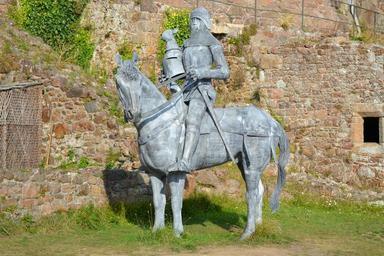Keywords: sir hugh calveley sculpture knight on a charger helmet sword suit of armour chain mail mont orgueil castle horse castle