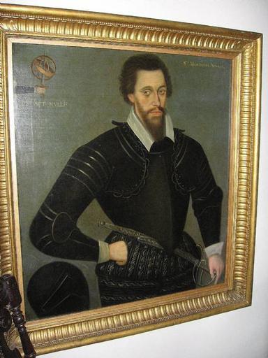 | Keywords: picture frame SIR MAXIMILIAN NORRIS (also known as Norreys) was a relative of Henry Norreys, Keeper of the King's Privy Purse, who was executed in 1536 for alleged adultery with Queen Anne Boleyn. Maximilian was one of five brothers who campaigned in Ireland and on the Continent against the Spanish; he was killed fighting in Brittany in 1593. The present representatives of the Norris family are the Berties, Earls of Abingdon. This painting dates from c.1800 (the frame dating from that period) and is a copy of a 16th century lost original. It is typical of much Elizabethan portraiture in it's iconic feeling, use of symbolism and the fashionable poetic melancholic appearance of the sitter, who wears the 'sable harness' or black armour also in fashion at that time. Upper right the copyist has misspelt the knight's name as 'Maximisian' and upper left has incorrectly copied the Latin inscription as 'His Aut Nullis', which should read 'Hic Aut Nullus'. One can only presume the inscriptions on the original were indistinct. Beneath the sitter's name can faintly be discerned an overpainted inscription. The symbolism of the hand, sword and armillary sphere is interesting. The use of the armillary would suggest that the sitter was linked to the Court of Elizabeth l; it was much used there, especially by the Queen, as a symbol of constancy and (specifically) Protestant religious fidelity. The sword and hand represent military valour in pursuit of these virtues and the Latin translates as 'Without this, nothing'. SIR MAXIMILIAN NORRIS (also known as Norreys) was a relative of Henry Norreys, Keeper of the King's Privy Purse, who was executed in 1536 for alleged adultery with Queen Anne Boleyn. Maximilian was one of five brothers who campaigned in Ireland and on the Continent against the Spanish; he was killed fighting in Brittany in 1593. The present representatives of the Norris family are the Berties, Earls of Abingdon. This painting dates from c.1800 (the frame dating from that period) and is a copy of a 16th century lost original. It is typical of much Elizabethan portraiture in it's iconic feeling, use of symbolism and the fashionable poetic melancholic appearance of the sitter, who wears the 'sable harness' or black armour also in fashion at that time. Upper right the copyist has misspelt the knight's name as 'Maximisian' and upper left has incorrectly copied the Latin inscription as 'His Aut Nullis', which should read 'Hic Aut Nullus'. One can only presume the inscriptions on the original were indistinct. Beneath the sitter's name can faintly be discerned an overpainted inscription. The symbolism of the hand, sword and armillary sphere is interesting. The use of the armillary would suggest that the sitter was linked to the Court of Elizabeth l; it was much used there, especially by the Queen, as a symbol of constancy and (specifically) Protestant religious fidelity. The sword and hand represent military valour in pursuit of these virtues and the Latin translates as 'Without this, nothing'. |