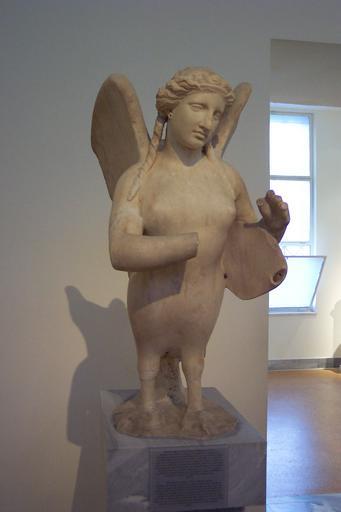Keywords: Siren statue - Athens.jpg Funerary statue of a siren in Pentelic marble found in the Necropolis of Ceramics at Athens The siren laments the dead wings folded playing on a tortoiseshell lyre The right hand which would have held the plectrum is missing The strings probably made of bronze would have been attached to the holes which can be seen in the body of the instrument The plumage and other parts would have been picked out in colour The statue flanked the stele of the Athenian warrior Dexileo who fell in combat in 394/393 BC Work of 370BC National Archeological Museum Athens Statue funéraire d'une sirène en marbre pentélique trouvée dans la nécropole du Céramique à Athènes La Sirène les ailes dressées lamente le défunt en jouant d'une lyre faite d'une carapace de tortue La main droite qui devait tenir le plectrum manque Les trous dans la caisse de l'instrument indiquent l'existence de cordes probablement en bronze Le plumage et d'autres parties du corps étaient rehaussés de couleur La Sirène flanquait la stèle du cavalier athénien Dexileo qui tomba au combat en 394/393 a C Œuvre de 370 a C Musée archéologique national Athènes own 10-2-07 Dagrappler Dagrappler <gallery> File Siren statue - Athens jpg File Sirenenstatue jpg File NAMA Sirène jpg </gallery> original upload log wikitable date/time username resolution size edit summary ---- 04 48 5 December 2007 User Dagrappler <a href http //upload wikimedia org/wikipedia/commons/6/65/100_2627 JPG ><img alt Thumbnail for version as of 04 48 5 December 2007 src http //upload wikimedia org/wikipedia/commons/thumb/6/65/100_2627 JPG/80px-100_2627 JPG width 80 height 120 border 0 /></a></td><td>1 440×2 160 409 KB <nowiki> Siren statue at Athens Archelogical Museum self-made 10-2-07 <a href /w/index php title User Dagrappler action edit redlink 1 class new title User Dagrappler page does not exist >Dagrappler</a> </nowiki> Statue of a Siren NAMA 774 |
