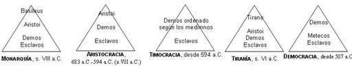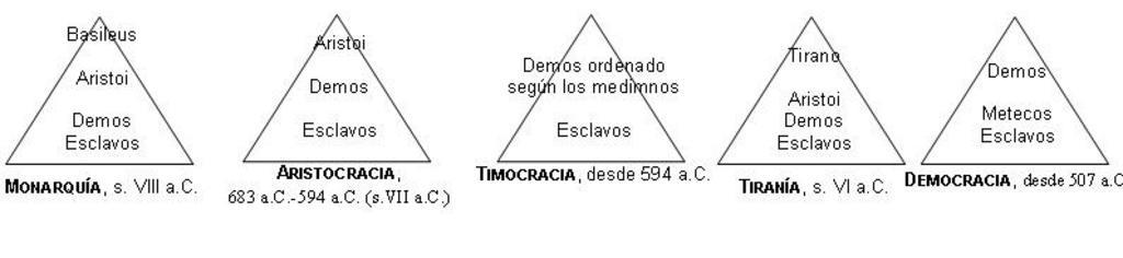 Keywords: Sistemas políticos Grecia Antigua.JPG Grecia fue la civilización donde de manera más consciente los políticos se esforzaron por conseguir un gobierno justo y equitativo para todos los ciudadanos En concreto brilló por su genio político la polis o ciudad-Estado de Atenas En la imagen cronológicamente ordenadas la sucesión de regímenes de la ciudad-Estado de Atenas que llevaron desde una monarquía o diarquía sistema común en Oriente Próximo en el siglo VII antes de Cristo hasta la Constitución democrática de Clístenes 510-507 a C Entre Monarquía y Democracia los atenienses experimentaron la Aristocracia la Oligarquía o Timocracia de Solón y la Tiranía asociada en Atenas al nombre de Pisístrato y los Pisistrátidas Este vocabulario para designar regímenes políticos que proviene de la Antigua Civilización Griega pervive en la actualidad con casi los mismos significados 2006-12-26 own assumed Pistachoveloz derivative works Sistema politico grecia antica svg Constitutional law Democracy Cleisthenes economia |