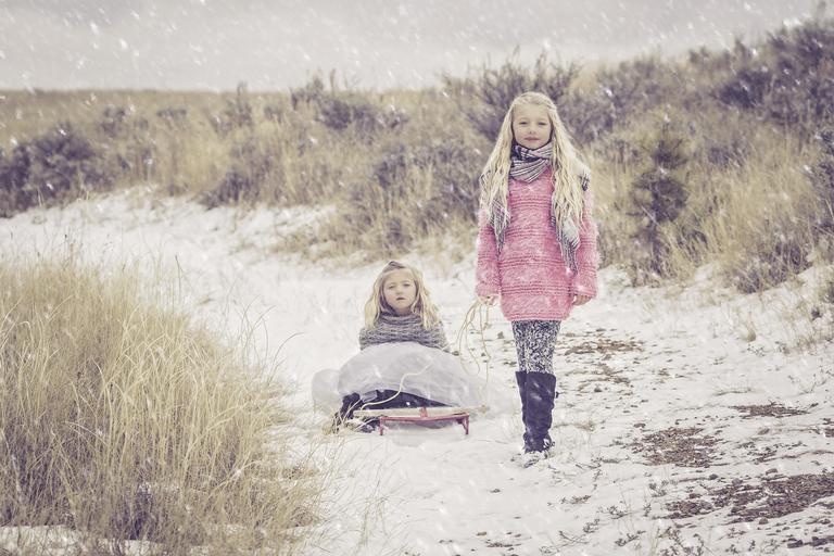 Keywords: sisters snow girl child cold childhood siblings sledding winter fun outdoor