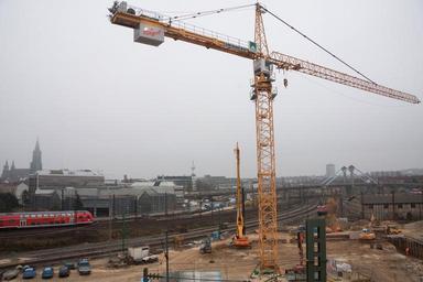 Keywords: site crane baukran construction work technology build metal construction machinery vehicles train trasse project stuttgart ulm fog