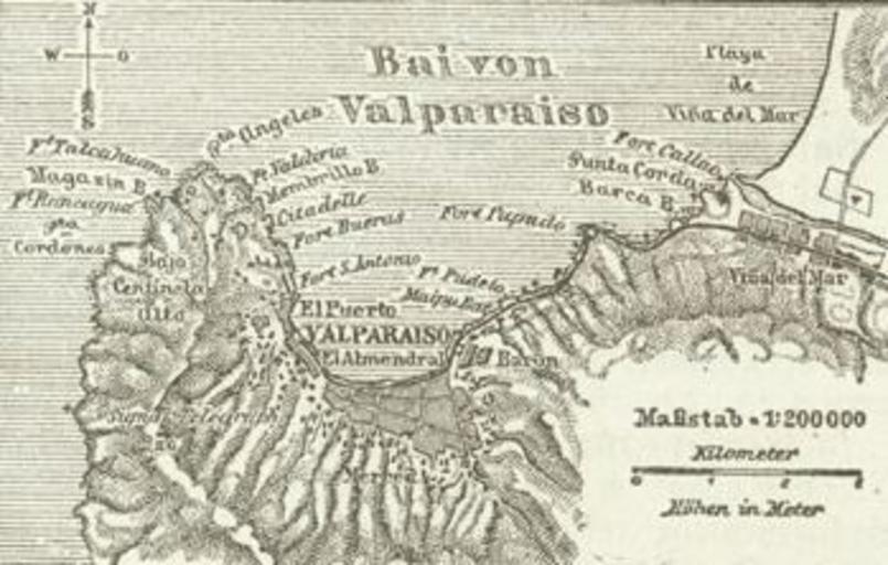 Keywords: Situationsplan von Valparaíso.jpg Quelle Meyers Konversationslexikon von 1888 Band 16 Seite 44 PD-Meyers Old maps of Valparaíso 1888 in Valparaíso