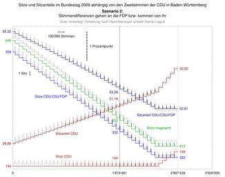 Keywords: Sitze und Sitzanteile im Bundestag 2009 abhängig von den Zweitstimmen der CDU in Baden-Württemberg – Szenario 2.svg de Darstellung des hypothetischen Ergebnis der Bundestagswahl 2009 wenn die CDU in Baden-Württemberg weniger oder mehr Zweitstimmen bekommen hätte Szenario 2 Stimmendifferenzen gehen an die FDP bzw kommen von ihr so dass die Summe von CDU und FDP konstant bleibt Bei einem Patt werden halbe Sitze verteilt die im Fall der Oberverteilung in der Unterverteilung an das Land mit dem höchsten unerfüllten Sitzanspruch gehen nächste Höchstzahl bei Sainte-Laguë höchster verbleibender Bruchteil bei Hare/Niemeyer Kontext Negatives Stimmengewicht own …¡ …¦ …« 2010-01-15 File Sitze und Sitzanteile im Bundestag 2009 abhängig von den Zweitstimmen der CDU in Baden-Württemberg “ Szenario 1 svg File Sitze und Sitzanteile im Bundestag 2009 abhängig von den Zweitstimmen der CDU in Baden-Württemberg “ Szenario 3 svg Voting systems Bundestag elections |