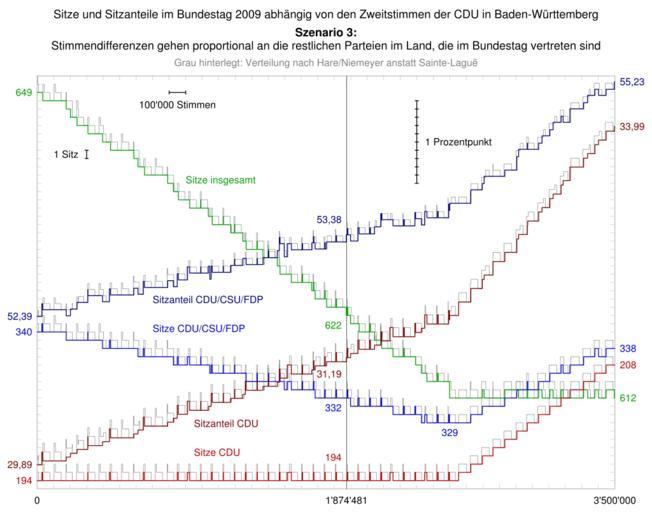 Keywords: Sitze und Sitzanteile im Bundestag 2009 abhängig von den Zweitstimmen der CDU in Baden-Württemberg – Szenario 3.svg de Darstellung des hypothetischen Ergebnis der Bundestagswahl 2009 wenn die CDU in Baden-Württemberg weniger oder mehr Zweitstimmen bekommen hätte Szenario 3 Stimmendifferenzen gehen proportional gemäß ursprünglichem Stimmenanteil stets nach Sainte-Laguë verteilt an die restlichen Parteien im Land die im Bundestag vertreten sind FDP SPD Grüne Linke bzw kommen ebenso von ihnen Bei einem Patt werden halbe Sitze verteilt die im Fall der Oberverteilung in der Unterverteilung an das Land mit dem höchsten unerfüllten Sitzanspruch gehen nächste Höchstzahl bei Sainte-Laguë höchster verbleibender Bruchteil bei Hare/Niemeyer Kontext Negatives Stimmengewicht own …¡ …¦ …« 2010-01-15 File Sitze und Sitzanteile im Bundestag 2009 abhängig von den Zweitstimmen der CDU in Baden-Württemberg “ Szenario 1 svg File Sitze und Sitzanteile im Bundestag 2009 abhängig von den Zweitstimmen der CDU in Baden-Württemberg “ Szenario 2 svg Voting systems Bundestag elections |
