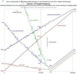 Keywords: Sitze und Sitzanteile im Bundestag 2009 abhängig von den Zweitstimmen der CDU in Baden-Württemberg – Szenario 1 mit Ausgleich.svg de Darstellung des hypothetischen Ergebnis der Bundestagswahl 2009 wenn die CDU in Baden-Württemberg weniger oder mehr Zweitstimmen bekommen hätte und wenn à berhangmandate ausgeglichen würden Szenario 1 Fehlende Zweitstimmen sind ungültig da die Erststimme unverändert bleibt ; zusätzliche Stimmen kommen von Nichtwählern die mit der Erststimme ungültig wählen oder von ungültigen Zweitstimmen die aber nur beschränkt verfügbar sind Die verwendete à berhangregel besteht darin dass zunächst das normale Ergebnis berechnet wird In der Oberverteilung wird dann die Sitzzahl schrittweise erhöht bis jeder Partei mindestens so viele Sitze zugeteilt werden wie zunächst inklusiv à berhang berechnet worden waren Die Unterverteilungen beruhen dann auf interner Kompensation bei à berhang wird die Sitzzahl schrittweise verkleinert bis sich unter Berücksichtigung des à berhangs die vorgegebene Sitzzahl ergibt bei Hare/Niemeyer kann das im Einzelfall zu nicht vergebbaren Sitzen führen Vergleichsgrafik ohne die hypothetische Ausgleichsregelung File Sitze und Sitzanteile im Bundestag 2009 abhängig von den Zweitstimmen der CDU in Baden-Württemberg “ Szenario 1 svg Bei einem Patt werden halbe Sitze verteilt die im Fall der Oberverteilung in der Unterverteilung an das Land mit dem höchsten unerfüllten Sitzanspruch gehen nächste Höchstzahl bei Sainte-Laguë höchster verbleibender Bruchteil bei Hare/Niemeyer Kontext Negatives Stimmengewicht own …¡ …¦ …« 2010-01-25 Voting systems Bundestag elections |